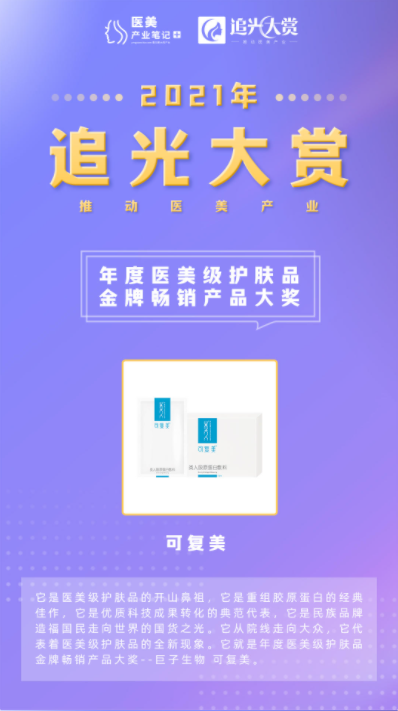 2021年12月2日,由医美产业笔记主办的“新医美加速生长·2021全球医美大会暨追光大赏颁奖盛典”在深圳大中华希尔顿酒店盛大开幕。在本次大会上,可复美斩获年度医美级护肤品金牌畅销产品大奖。